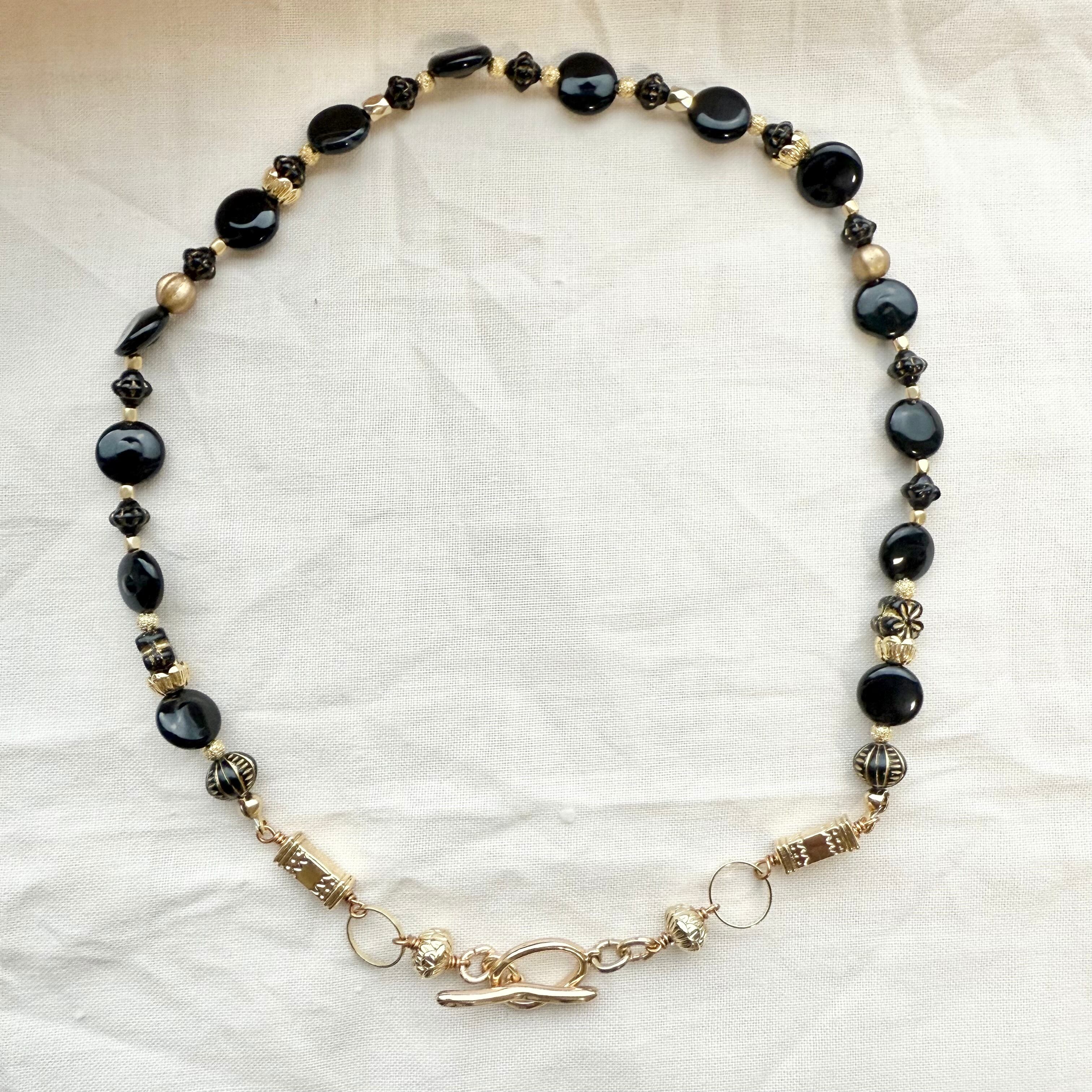 深い黒色が神秘的に輝くオニキスと、華やかなゴールドビーズをコンビネーションしたネックレス。