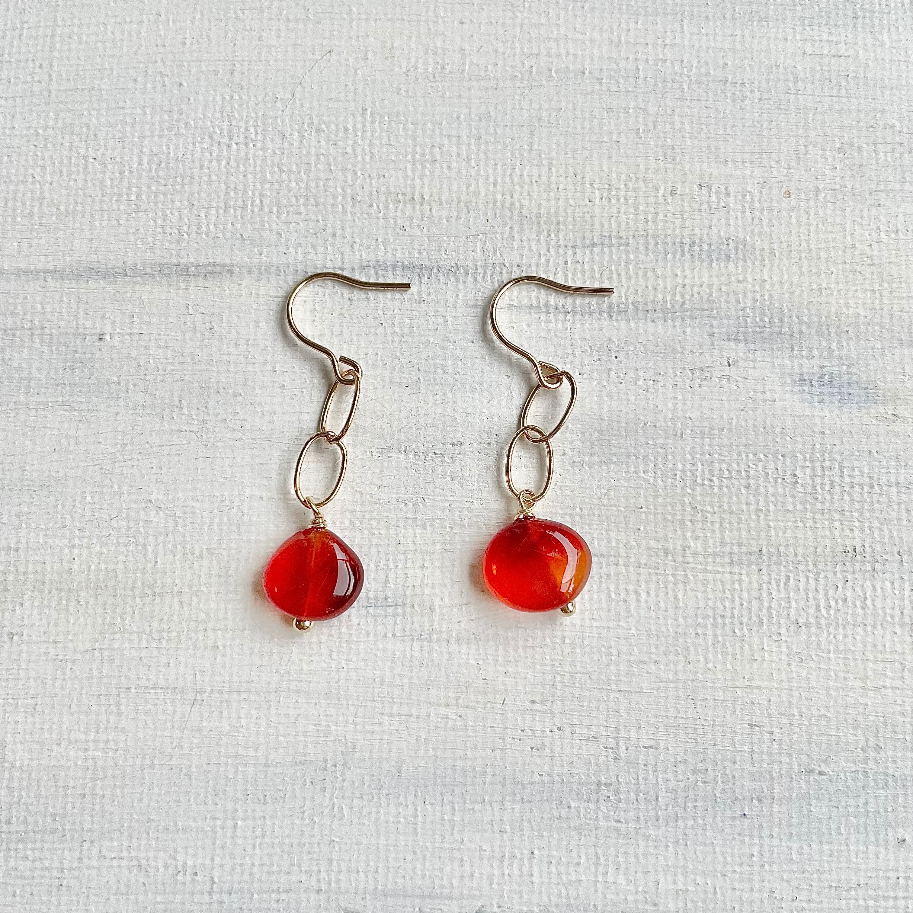 素材:カーネリアン、チェーン:14kgf、ピアス:14kgf、イヤリング:真鍮メッキ