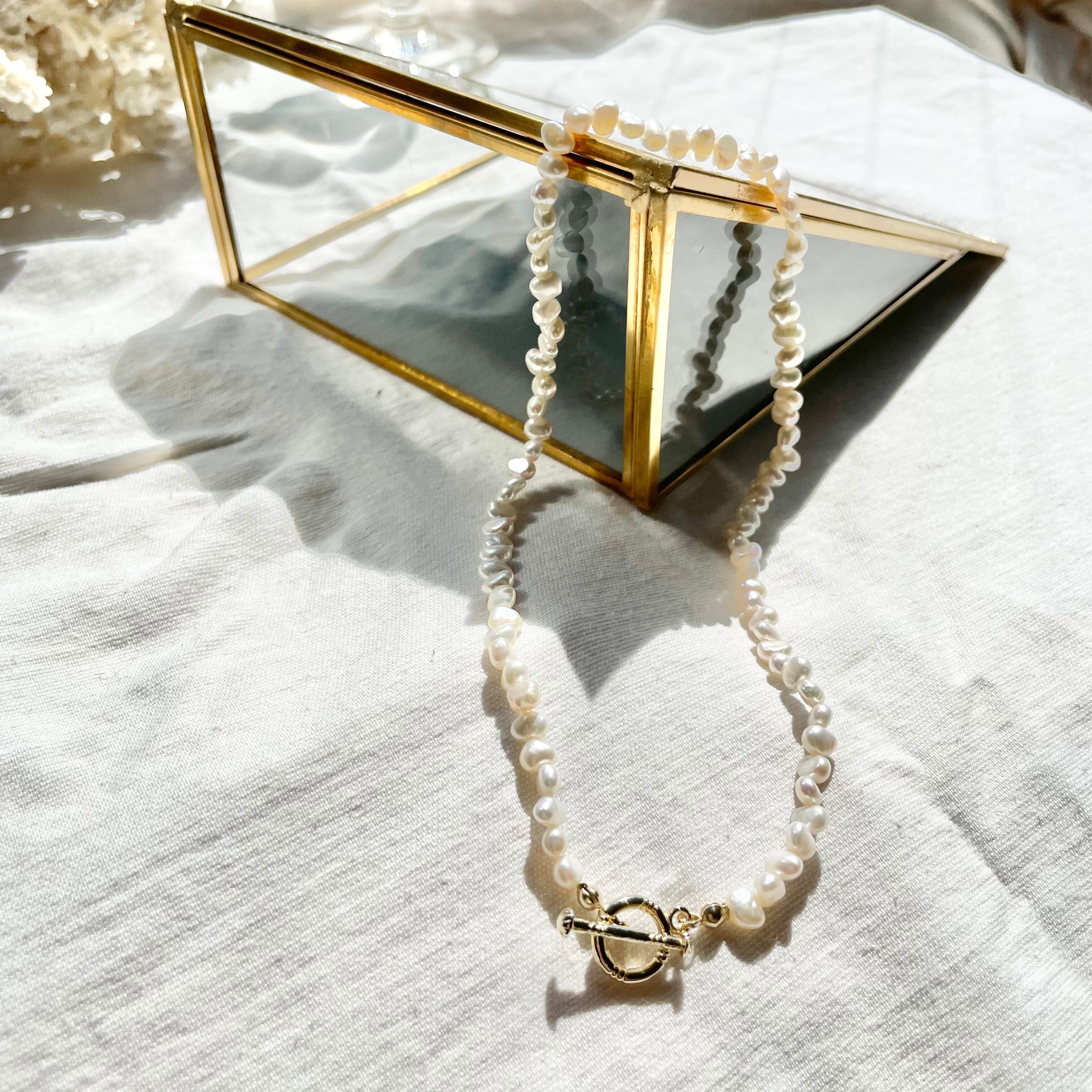 ツヤがあり一粒一粒に個性がある淡水パールを、シンプルなネックレスにしました。しなやかに動くけれど、切れにくい特別な糸で紡いでいます。