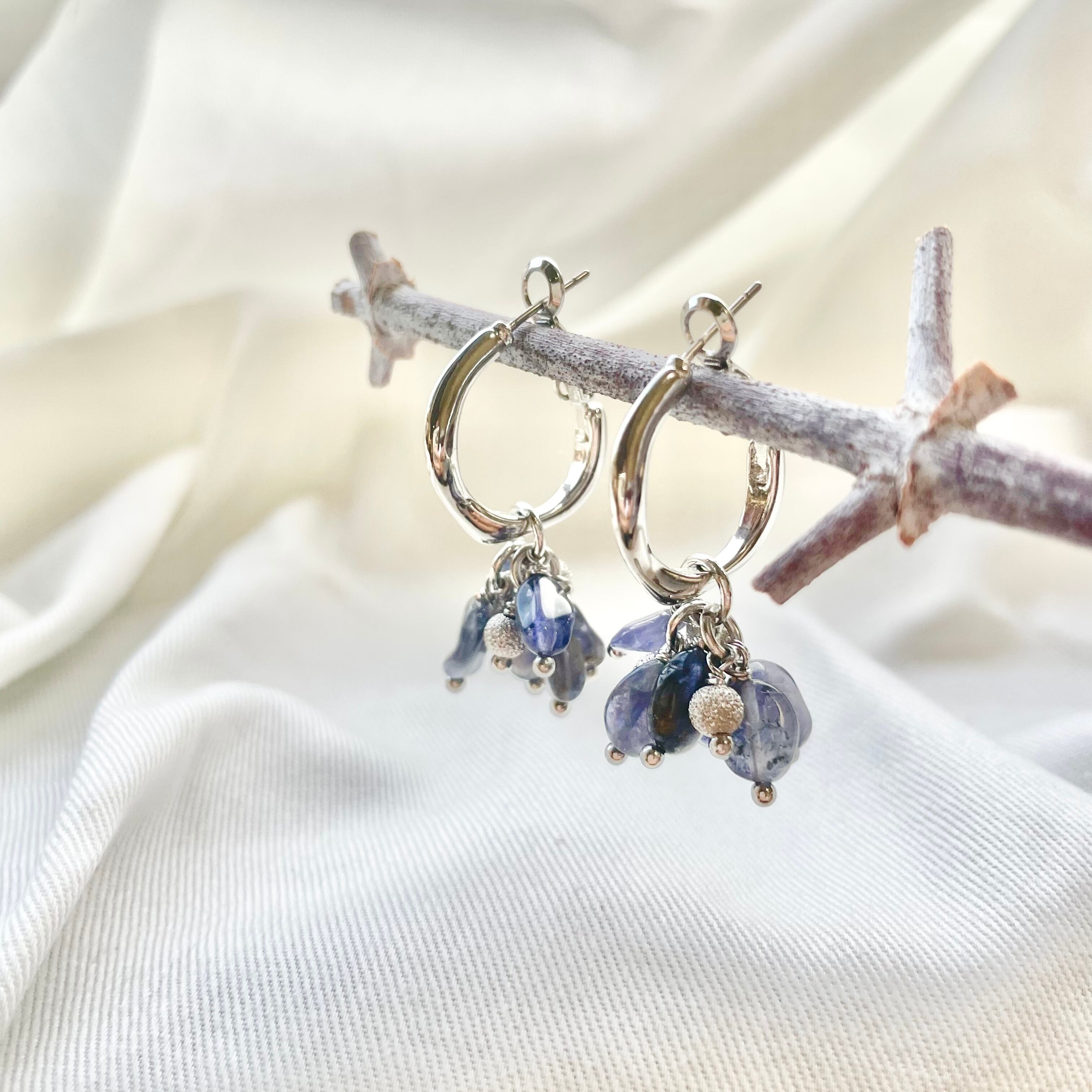 つぶつぶのアイオライトと、シルバーカラービーズが動くたびシャラシャラと心地よく揺れます。