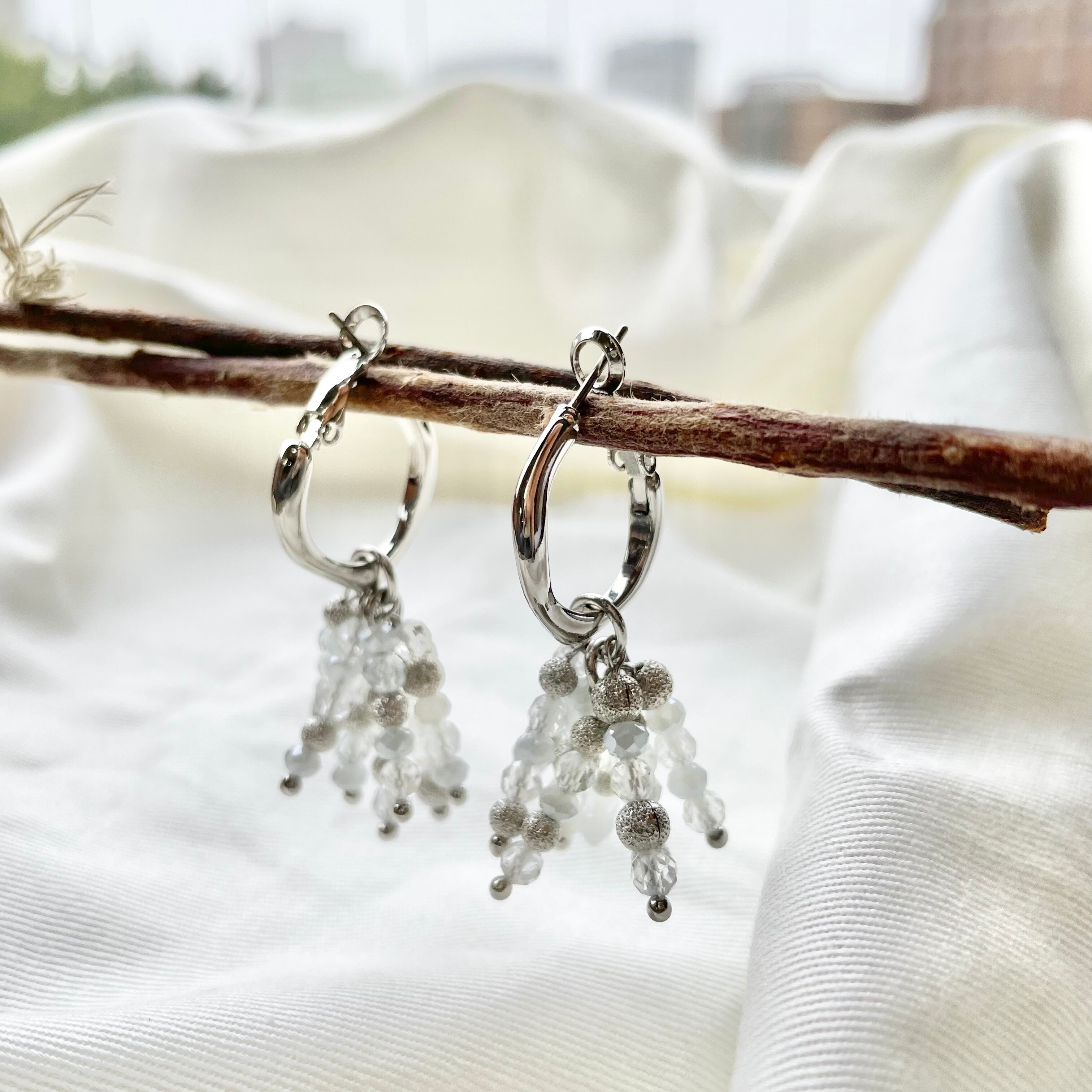 透明感のあるブルートパーズと、シルバーのメタルやガラスビーズ、洗練された形のフープが耳元でシャラリと揺れます。