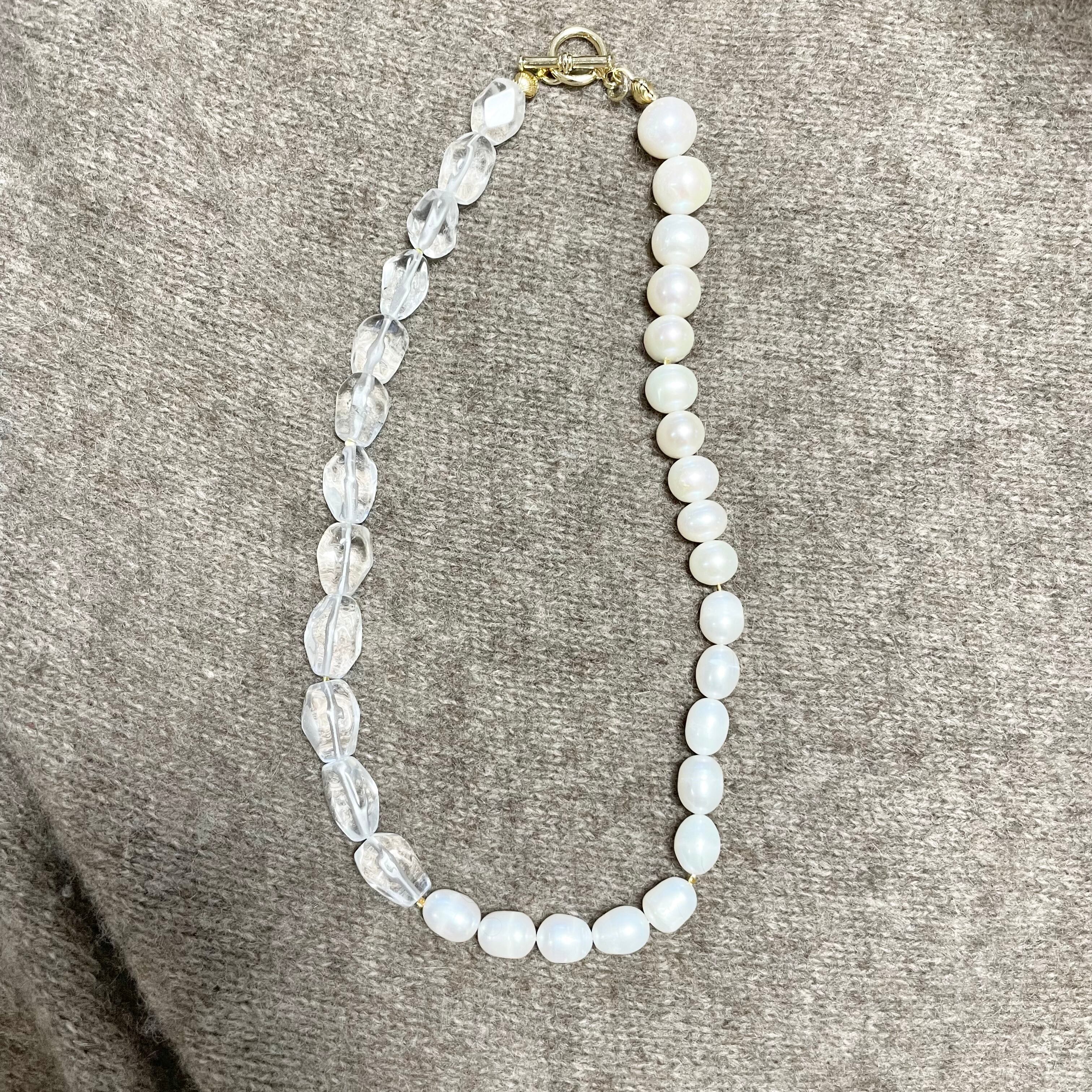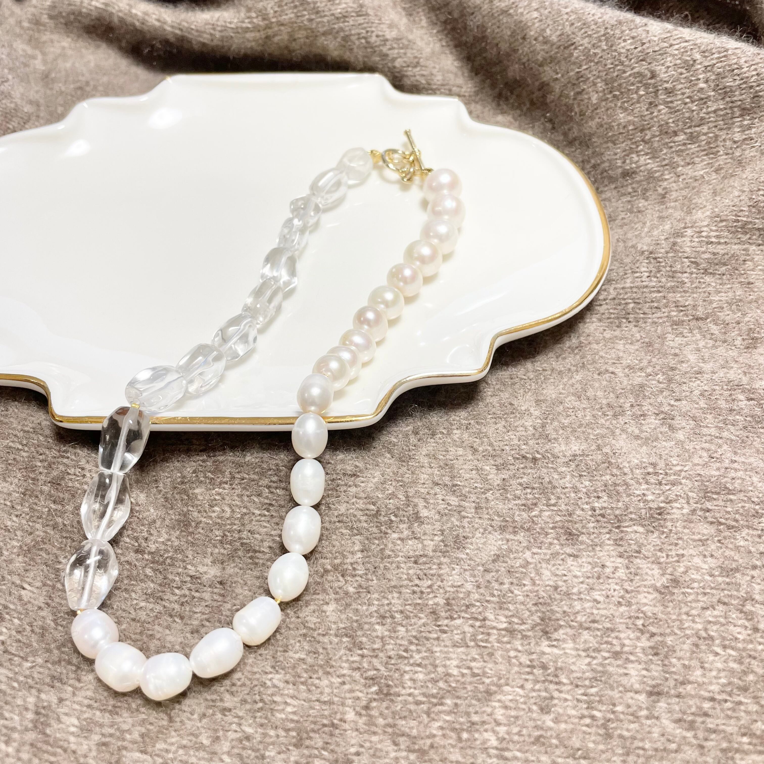 水晶と淡水パールをバランスよく並べて、ネックレスに仕立てました。