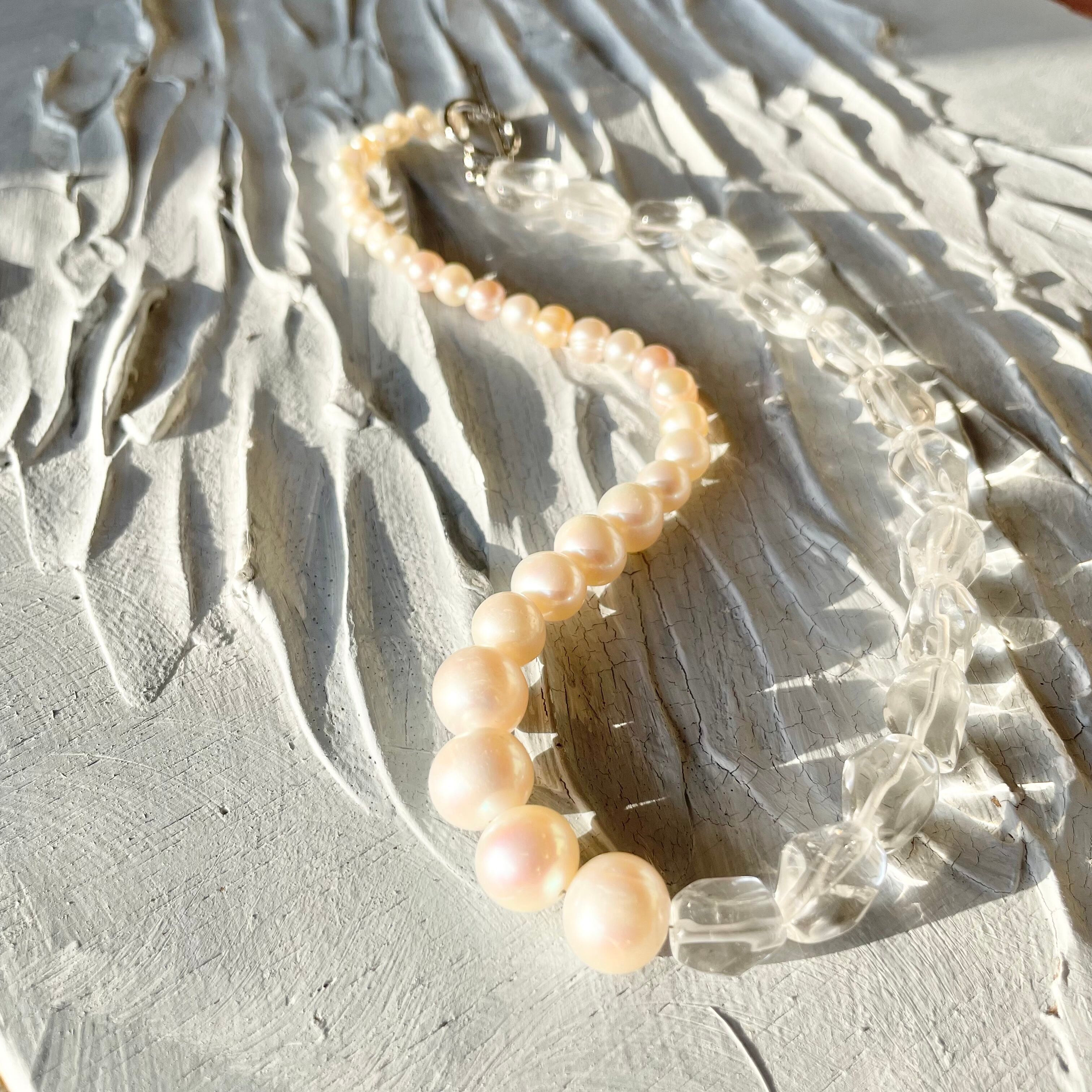 水晶と淡水パールをバランスよく並べて、ネックレスに仕立てました。